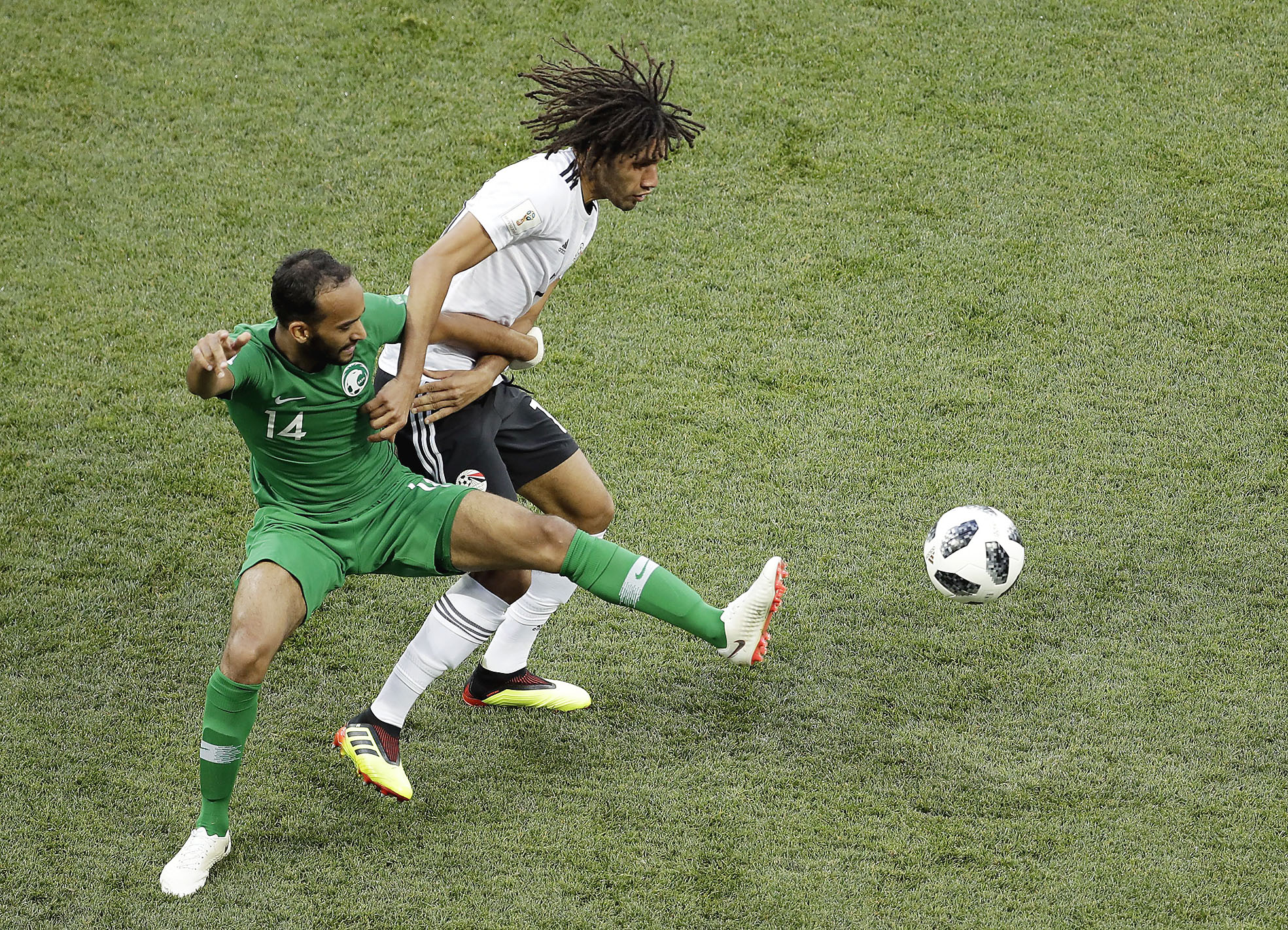 Saudi Arabia's Abdullah Otayf (left) challenges Egypt's Mohamed Elneny for the ball. (AP Photo/Themba Hadebe)