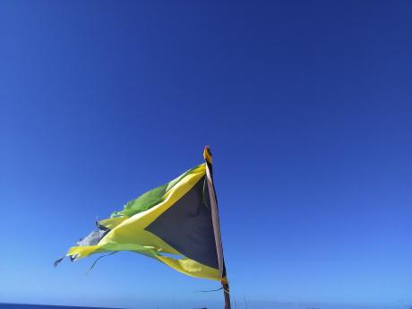 Bracing the elements and flying high - Jamaican flag at Nine Mile Beach in Negril.