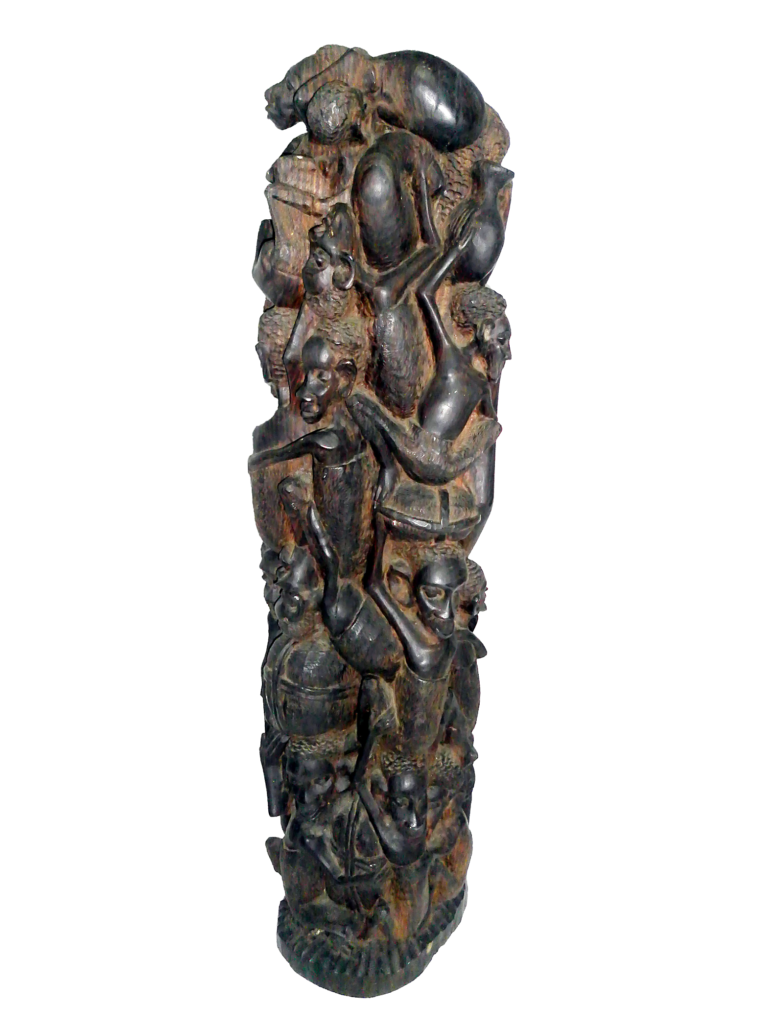 It is said that some of the finest carvings in modern history come from the Makonde people of Tanzania. The Makonde are an ethnic group that resides in Mozambique and Southern Tanzania. They have a long tradition of wood carving that reflects the intricacies and complexity of their society. Their work can be described as a mixture of imagination, wit, and vitality, which reflects the use of cultural myths and stories as inspiration for their masterful work. The flow and movement of the human form figures prominently in their work, and the relationship between man and nature is represented through the symbolic use of animals.