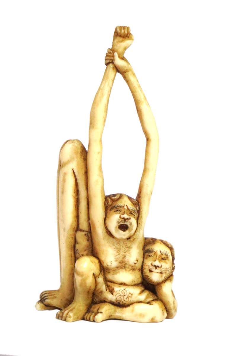 Another example of a netsuke is the Ashinaga-tenaga, which translates to ‘long legs, long arms’ which is a pair of yōkai or supernatural monsters in Japanese folklore. One, Ashinaga-jin, has extremely long legs, while the other, Tenaga-jin, has extremely long arms. The pair is commonly described as people from two countries, the ‘Long-Legged Country’ and the ‘Long-Armed Country’. As the names suggest, the inhabitants of these two countries possess unusually lengthy arms and legs. The two work together as a team to catch fish by the seashore. In order to do this, the long-armed man, Tenaga, climbs on to the back of the long-legged man, Ashinaga. Ashinaga then wades out into the shore waters, staying above water with his long legs, while the Tenaga uses his long arms to grab fish from his partner’s back. The pair is said to symbolise the longevity of the emperors and the eternity of the Imperial Court. Tenaga and Ashinaga are frequently portrayed as a subject matter of netsuke as they symbolise prosperity and infinity.