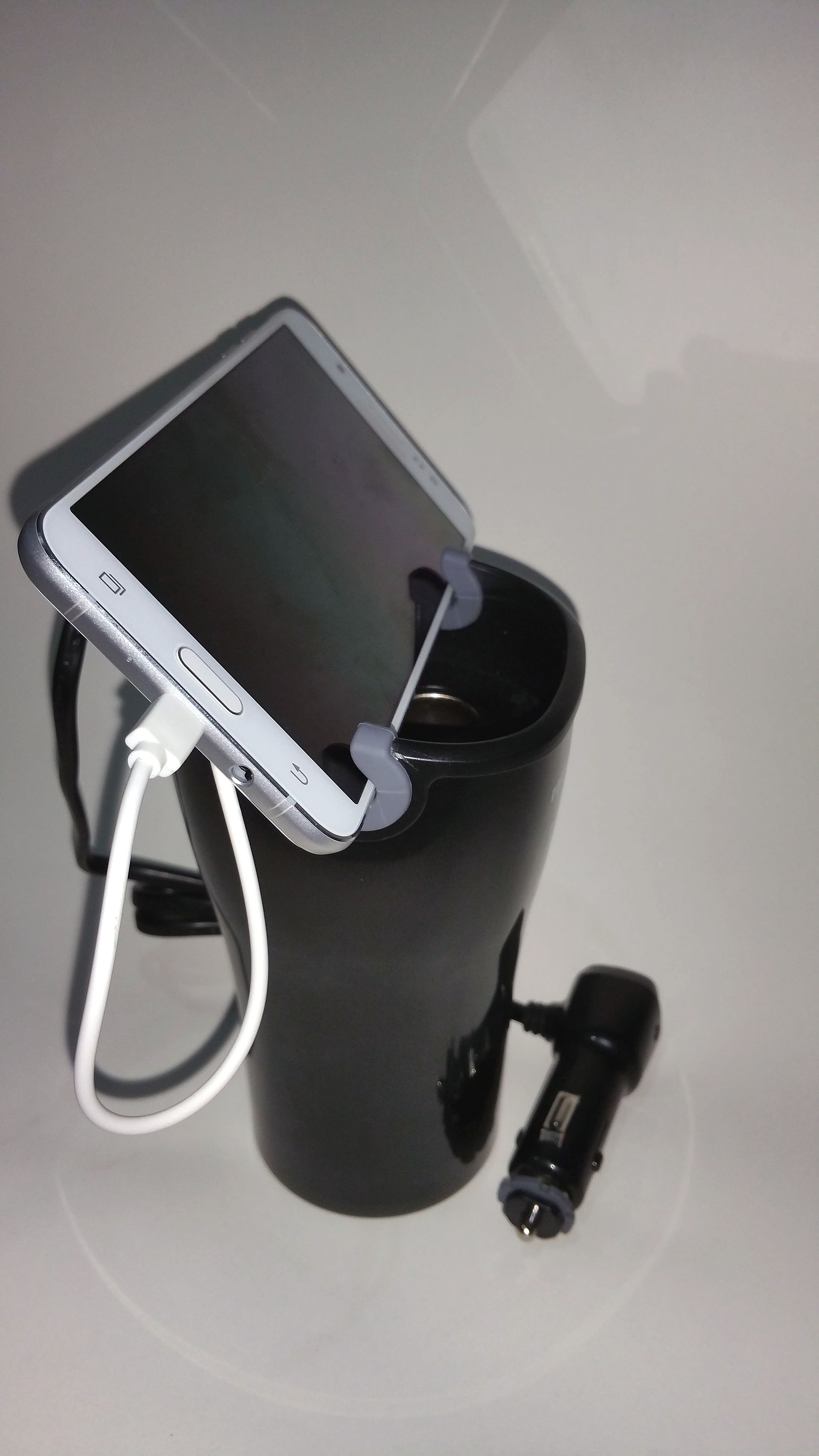 Beside the two USB ports is a micro USB cable, which is intended to charge a cell phone. There are also two grooves at the top of the cup, where the user can rest his cell phone firmly while it charges.