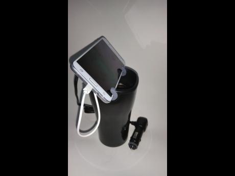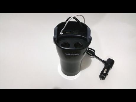 The first one is a power cup phone charger and holder, made by Radio Shack. It is design to look like a typical insulated mug that most persons carry coffee in. The design is strategic as it is intended to fit in the average centre console cup holder of any vehicle.
