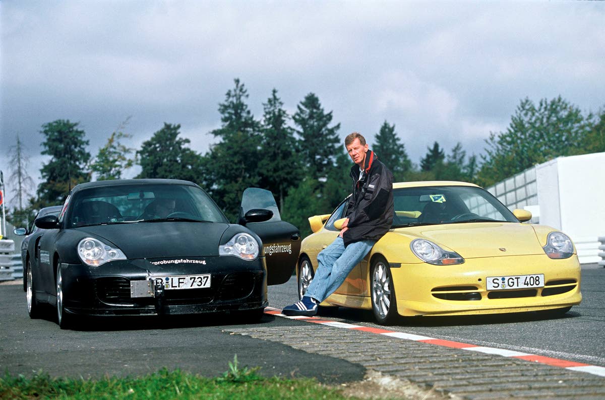 For the first time, the model was not given the designation ‘RS’ for Race Sport but the name ‘GT3’ – a reference to the GT class in which the motorsport versions of the model were to compete. The water-cooled 3.6-litre six-cylinder boxer engine of the new sports car delivered 265 kW (360 PS). Therefore, it was hardly a surprise that the Porsche 911 GT3 had already earned its first laurels even before its debut in Geneva. With Röhrl at the wheel, it completed the 20.8-kilometre Nürburgring Nordschleife in less than eight minutes — and in so doing, set a new benchmark for road-going sports cars.
