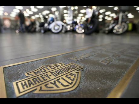 In this April 26, 2017, file photo, rows of motorcycles are behind a bronze plate with corporate information on the showroom floor at a Harley-Davidson dealership in Glenshaw, Pa. (AP)