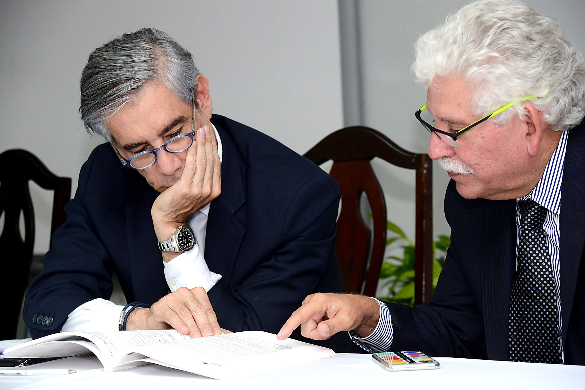 Pedro Paris Coronado (left), chief executive officer of PBS Group, listens attentively to Jose Misrahi, Facey Group chief financial officer, at the Productive Business Solutions Limited annual general meeting at the General Accident building, 58 Half-Way Tree Road, St Andrew, last week.