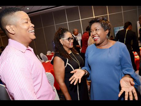 Shane Barnes, manager of Massy Technologies InfoCom, shares a hearty laugh with Carol WongSam, director of Massy Technologies InfoCom, at the Private Sector Organisation of Jamaica/Jamaica Money Market Brokers annual economic forum at The Jamaica Pegasus hotel in New Kingston last Thursday.