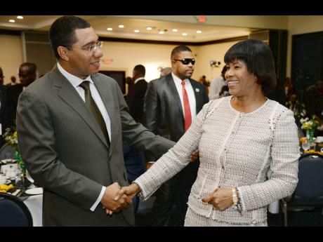 Opposition Leader Andrew Holness greets Prime Minister Portia Simpson Miller at the annual National Leadership Prayer Breakfast at the Jamaica Pegasus Hotel in New Kingston last Thursday