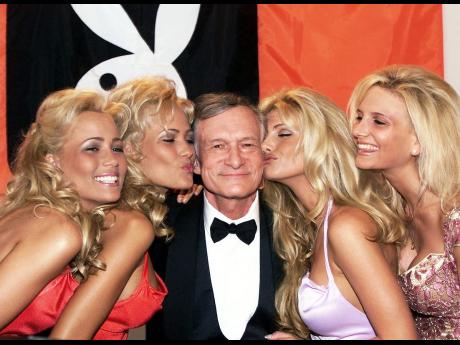 In this May 14, 1999 file photo, Playboy founder and editor-in-chief Hugh Hefner receives kisses from Playboy playmates during the 52nd Cannes Film Festival in Cannes, France.