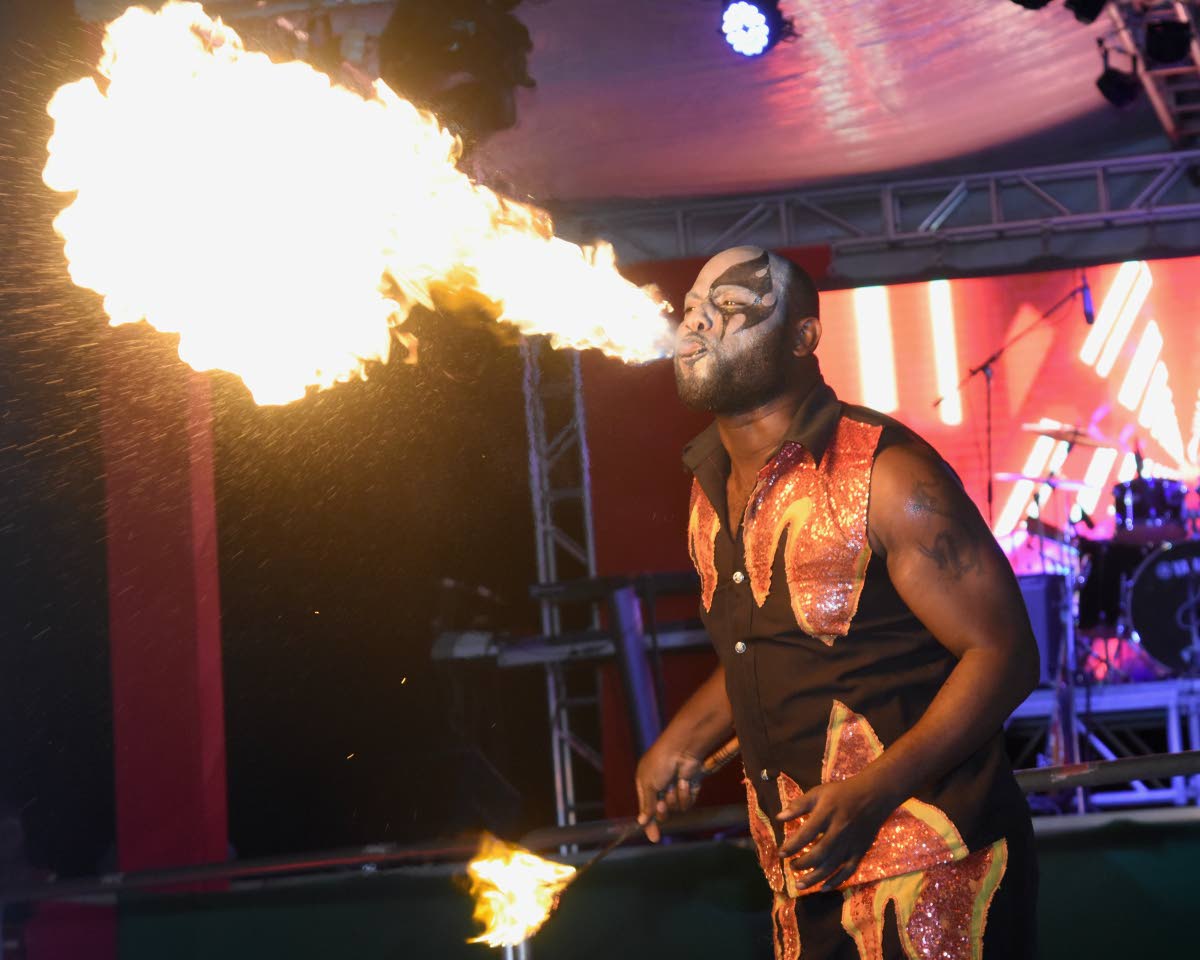 Sheldon ‘Brainstar’ Donaldson heating up the audience during his fire-breathing performance at the Kulcha Explosion event for Couples Tower Isle 45th anniversary.