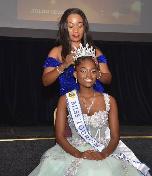 Miss Tourism Jamaica 2023 Andreka Nelson (back) crowns the new queen, Jolon Dewer.
