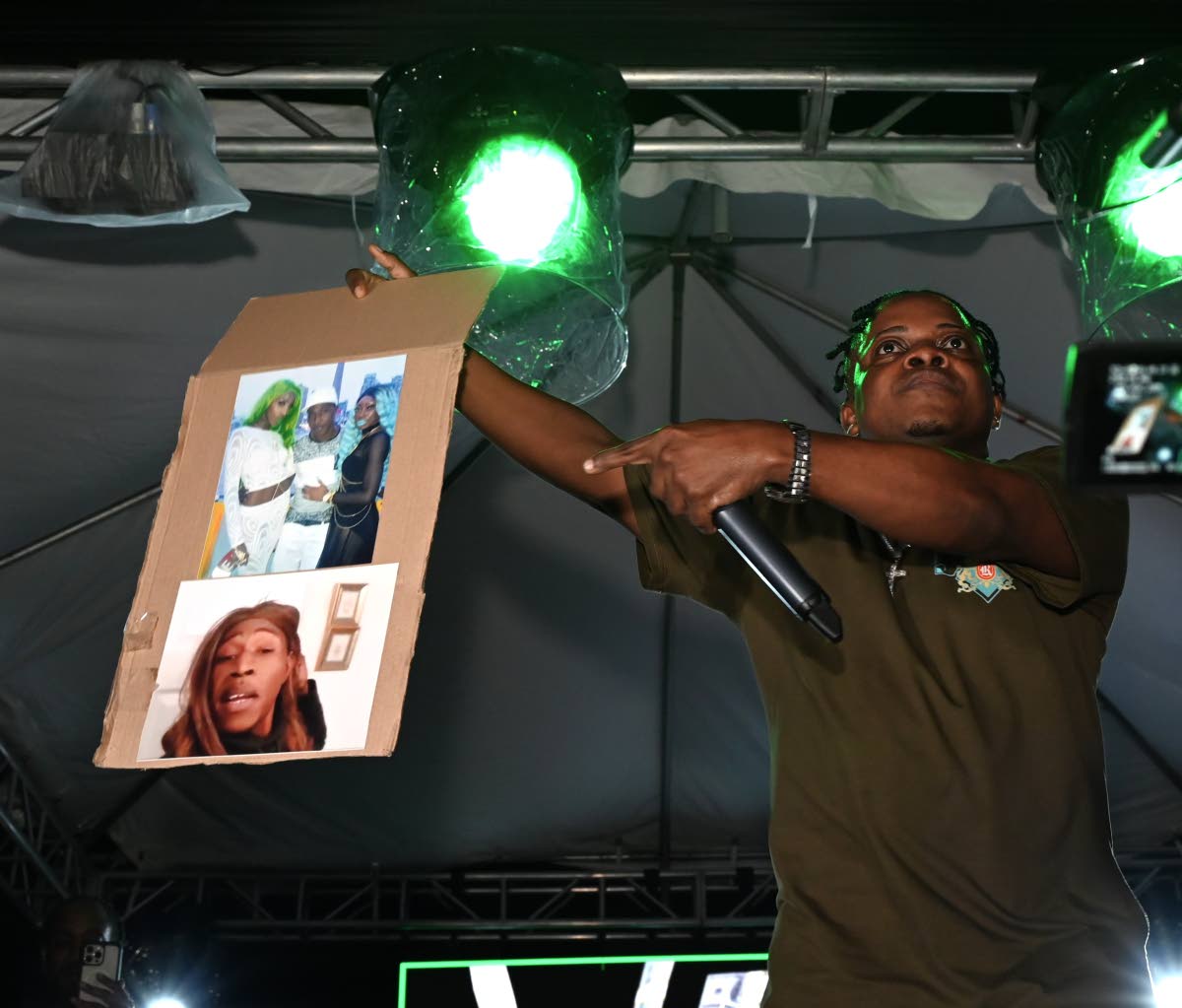 Likkle Shabba shows a cardboard of photos. He says he pulled old photos from social media to add a bit of “fun” to his clash against Tony Matterhorn.