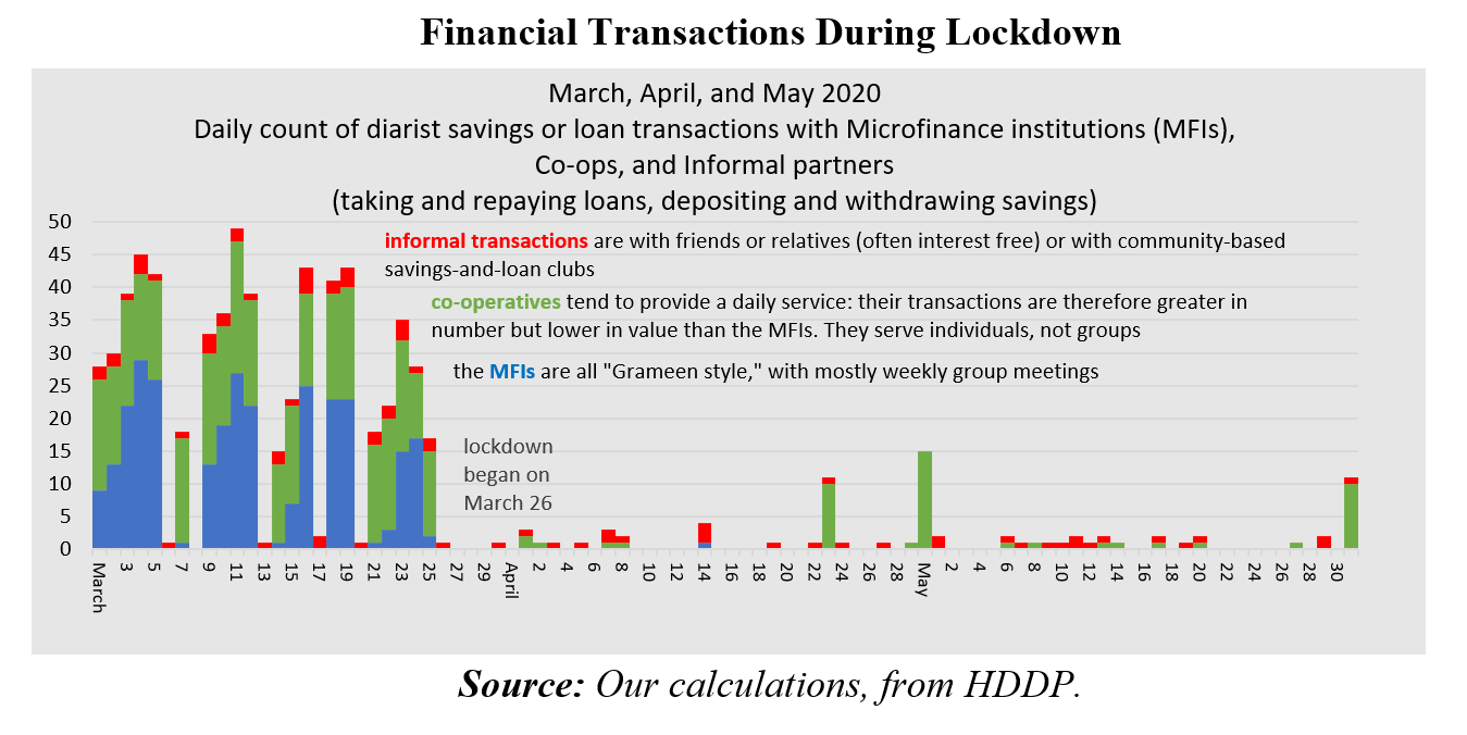 Harsh lockdowns in many places also forced microfinance providers and other financial institutions to close, preventing households from borrowing or even withdrawing their savings. The 60 Bangladeshi households in the HDDP study halted almost all financial transactions during the government-imposed lockdown.
