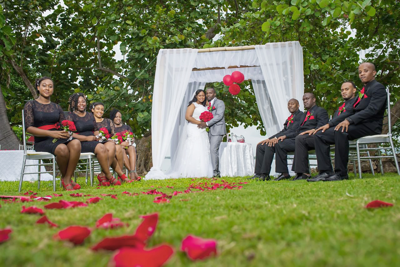 The enchanting union took place at Llantrissant Beach Cliff Villa, West End, overlooking Negril's Seven Mile Beach, on June sixth. Kacia marched down the aisle on the arms of her father in a white corset, mermaid dress with a cathedral veil from Bliss Bridal Boutique. Andrae was attired in a charcoal gray suit with black trimming by Pablo Palair Fashions. The bridal party were outfitted in black lace dresses accentuated with red belts. Their more than 100 guests all wore their wedding colours.