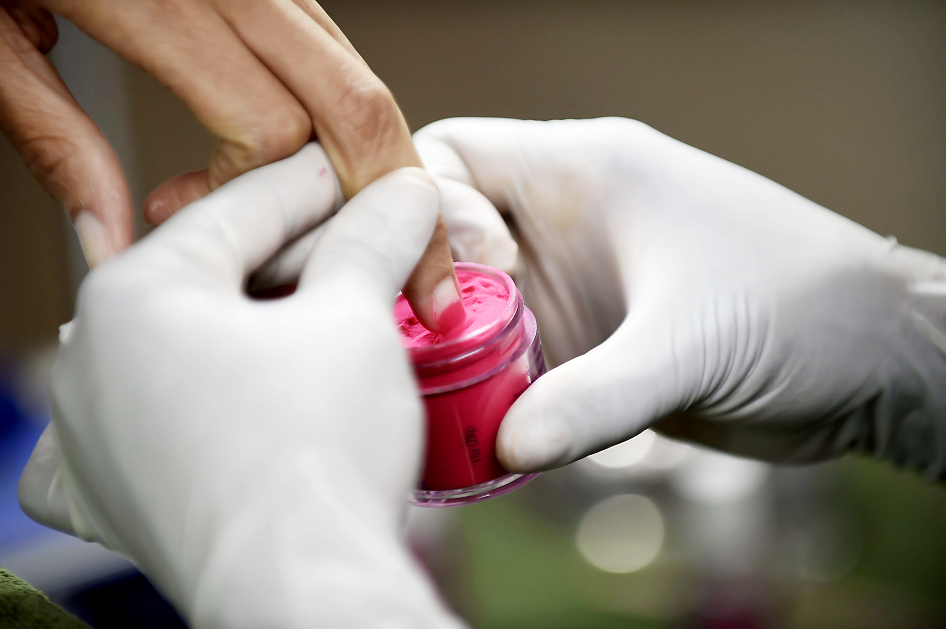 When it comes to the preparations of the nails there are five steps. After nails and cuticles are cleaned then the prep for the powder is applied to the nail, which, in essence, is to dry the nail. Then the pro-base is applied which aids in holding the powder to the nail, then dip. This step is done twice. And then the base is applied to seal it in. Nails are then buffed to ensure a smooth finish. An activator is then applied after which a finishing gel is applied for shine.