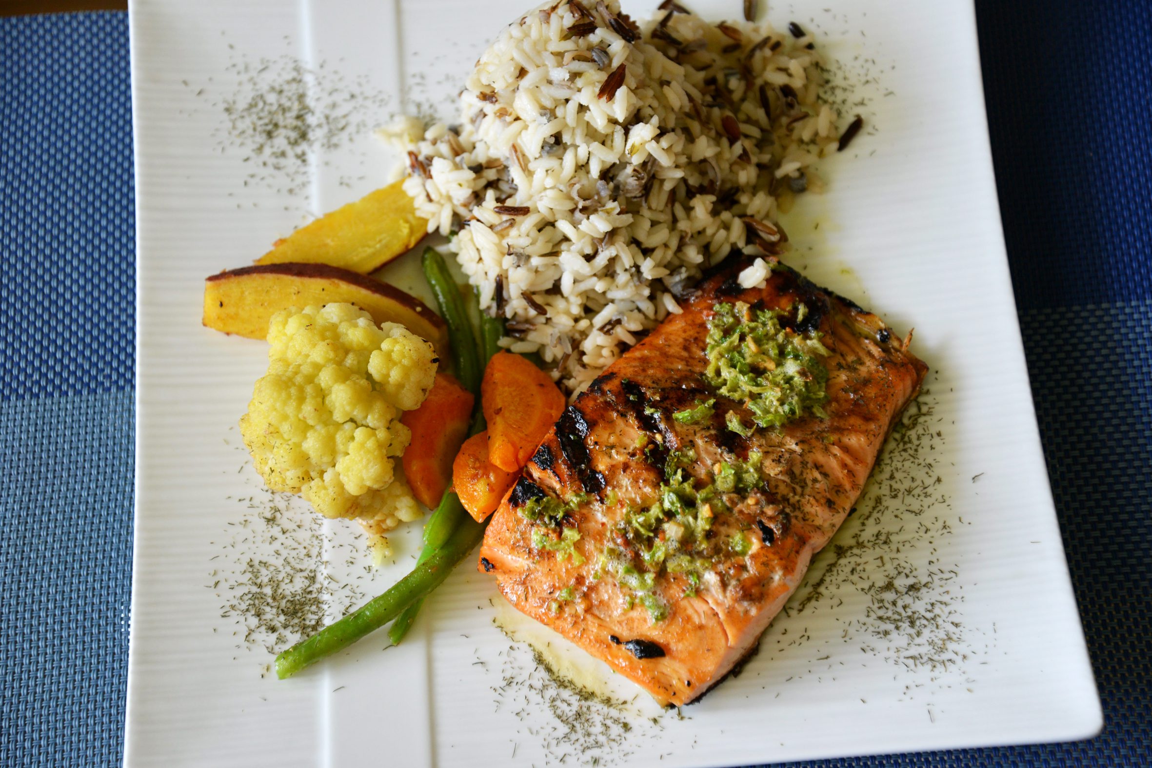 Karrie Williams Grilled salmon cooked with dill butter sauce and served with wild rice and sautéed vegetables