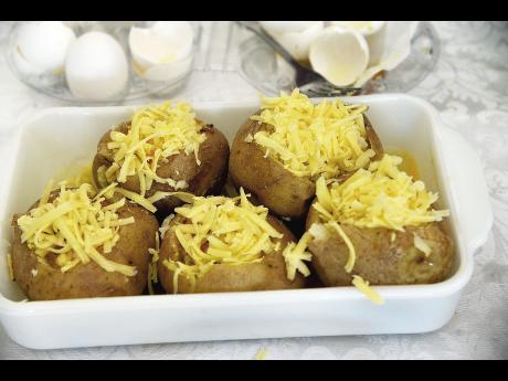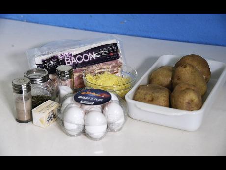 1. Put potatoes in oven for 10 minutes at 3508C. Lay first baked potato on its side, and use a knife to carefully cut off the top of the potato. With a spoon, scoop out the middle to make a 'bowl', leaving the potato walls as thick or thin as you'd like. (Just remember, the less room you leave, the more room for eggs, bacon and cheese!) Repeat with the