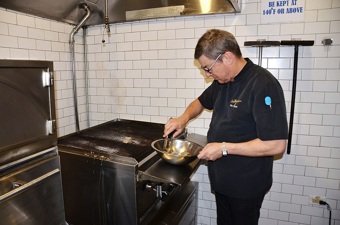 In photo: Michelin star executive chef, Ken Frank preparing grilled shrimp during a cooking class at the Half Moon Sugar Mill restaurant.-Janet Silvera