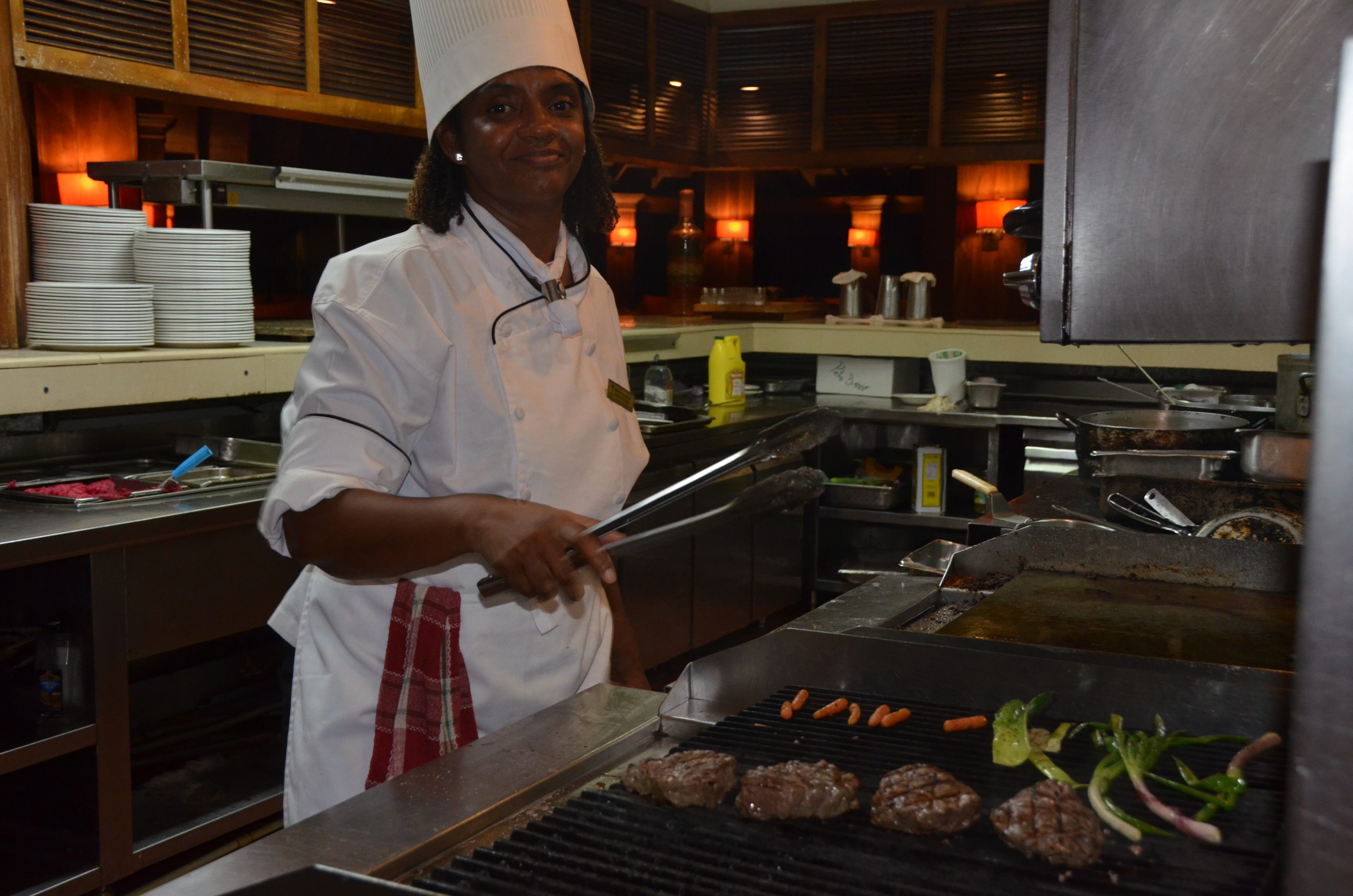 Jamaica's only female executive chef of a large hotel chain, Simone Haughton-Campbell, cooking up a storm at the Patois restaurant, Couples Swept Away.