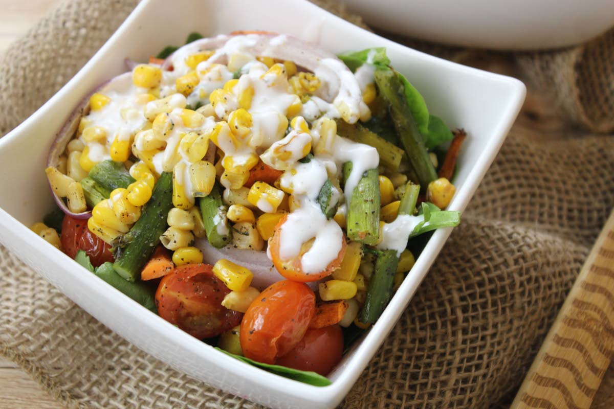 Preheat oven to 350ºF. Season corn, cherry tomato, carrots and asparagus with olive, salt and pepper and put to roast for 10 to 15 minutes. To serve, place on a bed of spinach and drizzle with cucumber dressing.