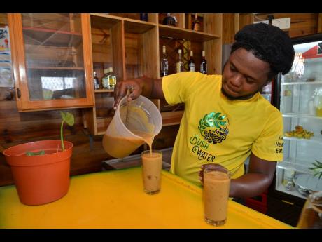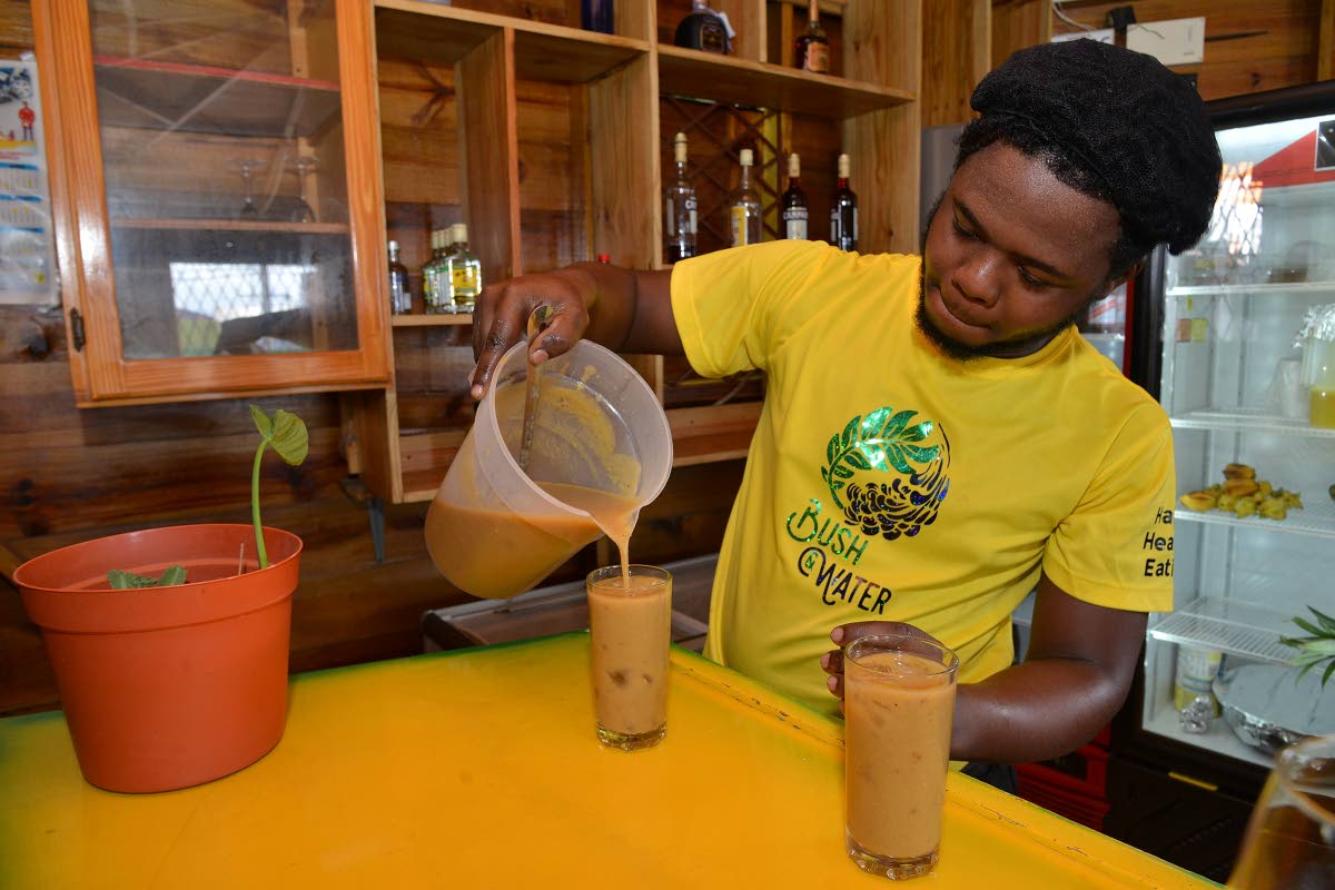 The one-year-old restaurant is located in Portmore’s version of a red-light district; 16 Port Henderson Road, just by the sea. When you first walk on to the compound, the first thing you’ll notice is its beautifully painted bamboo structure. The open floor plan dining room boasts dark brown, evenly varnished rum barrel dining furniture with sights into the kitchen and a view of a stage used for various live music events. The bar is where all the natural liquid goodies by the ‘Juice Chemist’, Kenrick Baimbridge, are prepared. Tasty smoothies, punches, green juices and even iced teas are done to order on any given day. As you explore to grounds and make your way to the back of the rustic structure, the work life of the local fishermen on the sea can be seen.