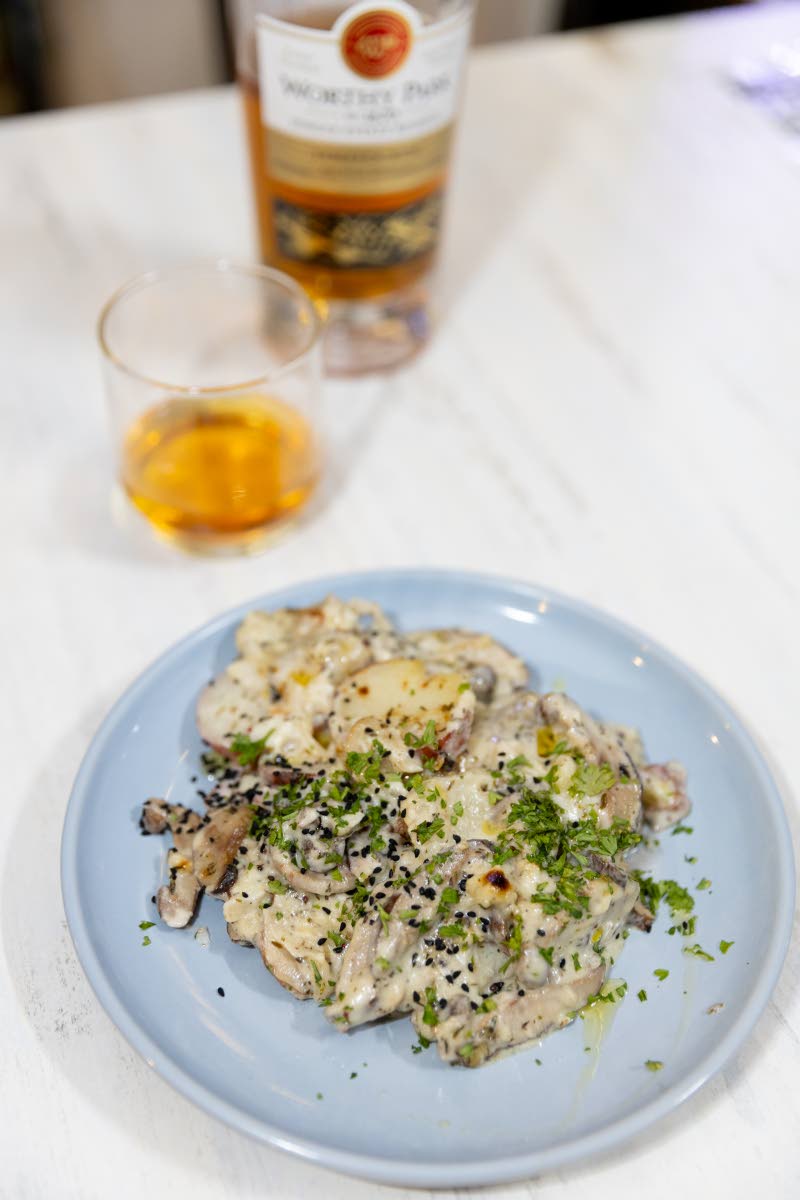 We are seduced by the pièce de résistance: the crispy umami gratin, an epicurean masterpiece that harmoniously unites locally sourced shiitake mushrooms and vibrant red-skinned potatoes. As it gracefully graces our palates, a crescendo of flavours envelops our senses, elevated by the ethereal embrace of velvety coconut cream. Each bite is an eruption of gastronomic ecstasy, perfectly paired with the exquisite Worthy Park Single Estate Reserve, its enigmatic essence intensifying the symphony of tastes that dance upon our tongues.
