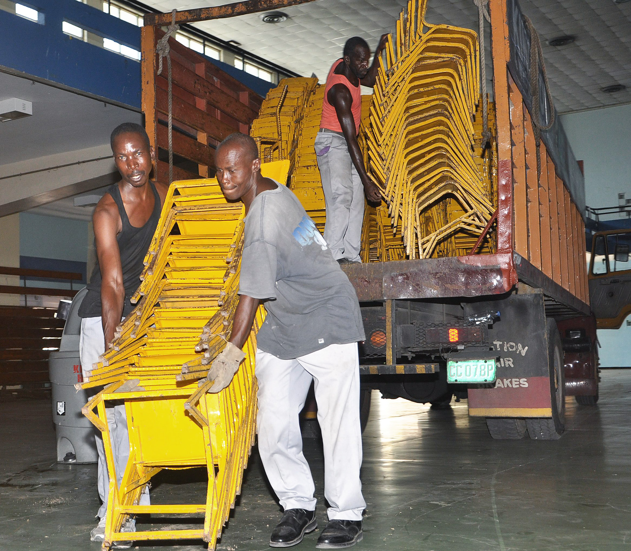 Jermaine Barnaby/Photographer Workmen getting the National Arena ready for today's annual conference of the Jamaica Labour Party where the National Housing Trust's purchase of property in Trelawny is expected to loom large.