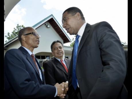 Prime Minister Andrew Holness (right) greets the Reverend Alston Henry (left) and David Wan, director of the National Housing Trust (NHT), on his arrival at the NHT's 40th anniversary service held yesterday at the Church of the Open Bible in St Andrew.