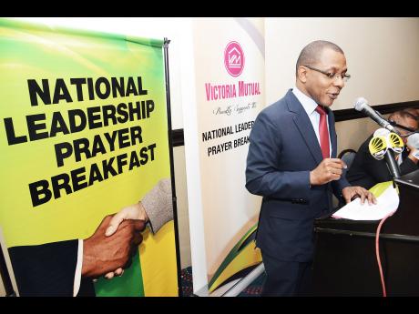 Courtney Campbell, president and CEO of Victoria Mutual Group, speaks to members of the media at the official launch of the 37th National Leadership Prayer Breakfast at The Jamaica Pegasus hotel yesterday.