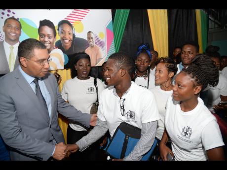 Prime Minister Andrew Holness ((left) meeting with youngsters at the Ministry of Local Government and Community Development Youth Summer Employment Programme official launch at the Jamaica College Auditorium in St Andrew on Thursday.