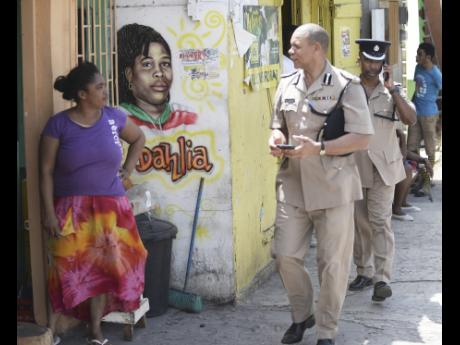 Deputy Commissioner of Police Clifford Blake (foreground) and Major General Rocky Meade walking the streets of Mount Salem, St James earlier this week.