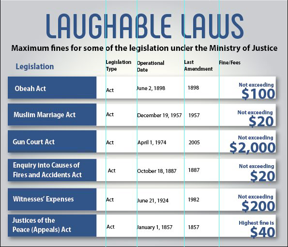 More than one year after Minister of Justice Delroy Chuck first indicated that the Government would be speedily reviewing and modernising Jamaican laws with ridiculously low fines, the justice ministry is now promising that the first set will be before Parliament this month.