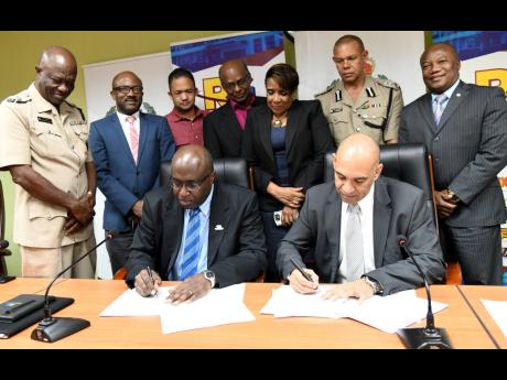 Gary Allen (seated, left), CEO of the RJRGLEANER Communications Group, and Police Commissioner Major General Antony Anderson sign a memorandum of understanding yesterday to partner in a road-safety campaign. Looking on are (from left) Superintendent Courtney Coubrie, operations officer at the police's Public Safety and Traffic Enforcement Branch (PSTEB); Milton Walker, group head of news at the RJRGLEANER Communications Group; Dr Parris Lyew-Ayee, executive director of Mona Geoinformatics Institute; Victor Anderson, programme coordinator of National Road Safety Council (NRSC); Paula Fletcher, executive director of the NRSC; Deputy Commissioner of Police Clifford Blake; and Senior Superintendent Calvin Allen, head of PSTEB.