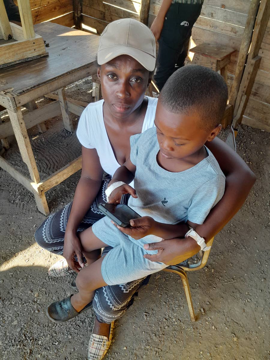 Davianne McDermott sits with her son, five-year-old Domanique. Sharing in the moment are his rescuers (from left) Kenroy McKenzie, 17; Roshane Roberts, 15; and Tyrese Wright, 17.