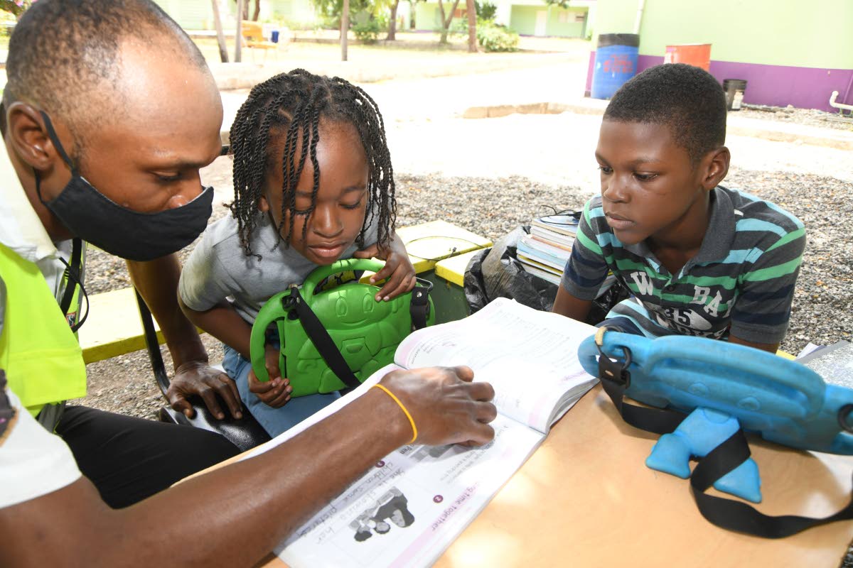 On a bench under a tree at the Liberty Academy at Priory in St Andrew, 33-year-old Shawn Muir guards the property while supervising and assisting his children with their studies.