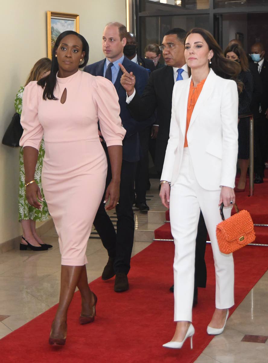 From a courtesy call at Jamaica House to stops in Kingston and Montego Bay, the Duke and Duchess of Cambridge, Prince William, and his wife, Kate, had a packed schedule on Wednesday. In the day, the duchess donned a white blazer and pants by British designer Alexander McQueen and optic white Jimmy Choos, accessorising with a tangerine silk top from Ridley London and a 1960s Raffia Beaded Bag. Inzzpire365’s Steelz and Mantraz ‘She’s Royal’ bracelet by Lashawndla Bailey-Miller made a second appearance, along with an adjustable pearl bracelet by the brand.