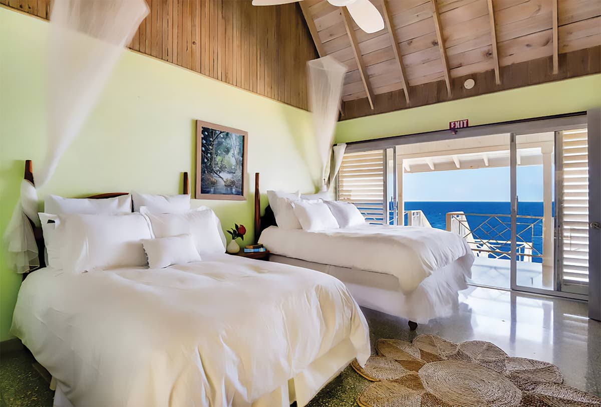 The spatial format also makes provision for three bedrooms and three bathrooms, with the entire casually decorated atmosphere defined primarily by local artwork, handmade wicker and blue mahoe furniture, by artisans extraordinaire. Specifications called for: high cathedral ceilings that humble those within, complete walls of glass sliding doors, admitting a sight beyond description.