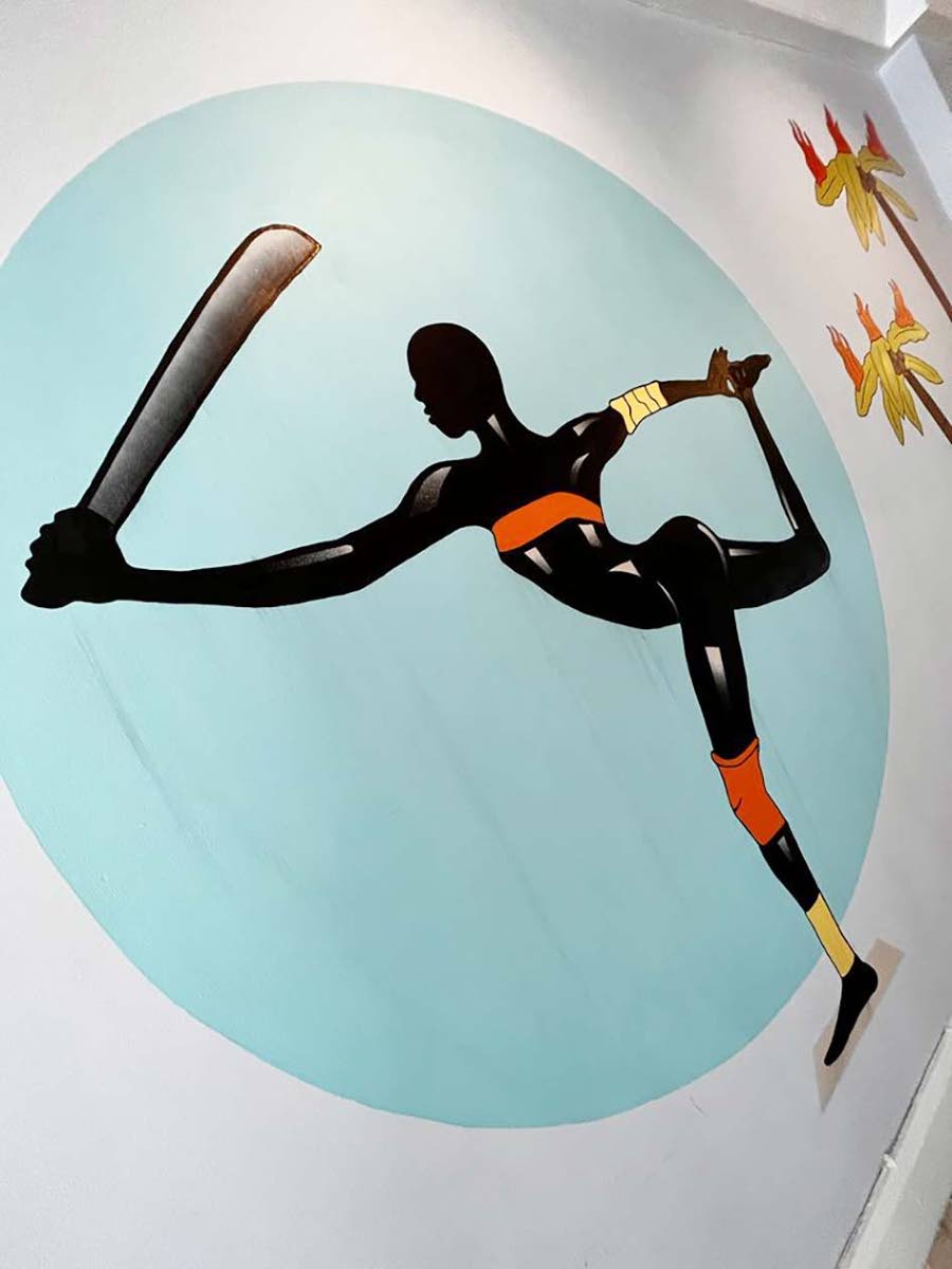 Jude’s mural in the coffee bar at Tower Isle, featuring a dreadlocked man on a unicycle, reminiscent of Wailers legend Peter Tosh, and a striking airborne female, ‘Grace Jones’, depicts what he describes as “an ironic juxtaposition of duality … bold and often reminiscent of graffiti and pop art. A colourful, humorous reflection on local culture and consumerism and what it means to be a Jamaican in this era,” he said.