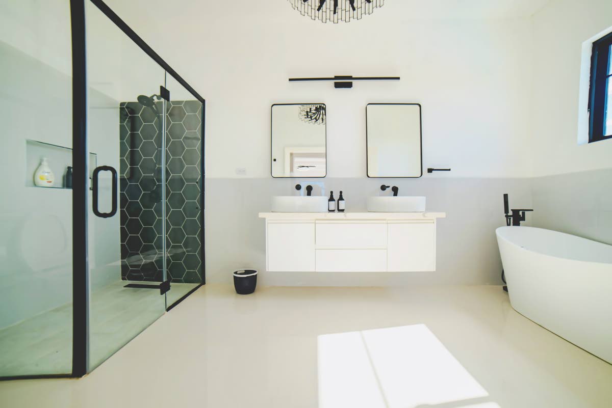 Compelling features include upstairs ‘tray’ ceilings, off-white porcelain tiles, white walls, and glass stair and balcony railings. There are also applaudable waterfall quartz countertops, glass-enclosed showers, soaking tubs, and floating double-basin vanities.