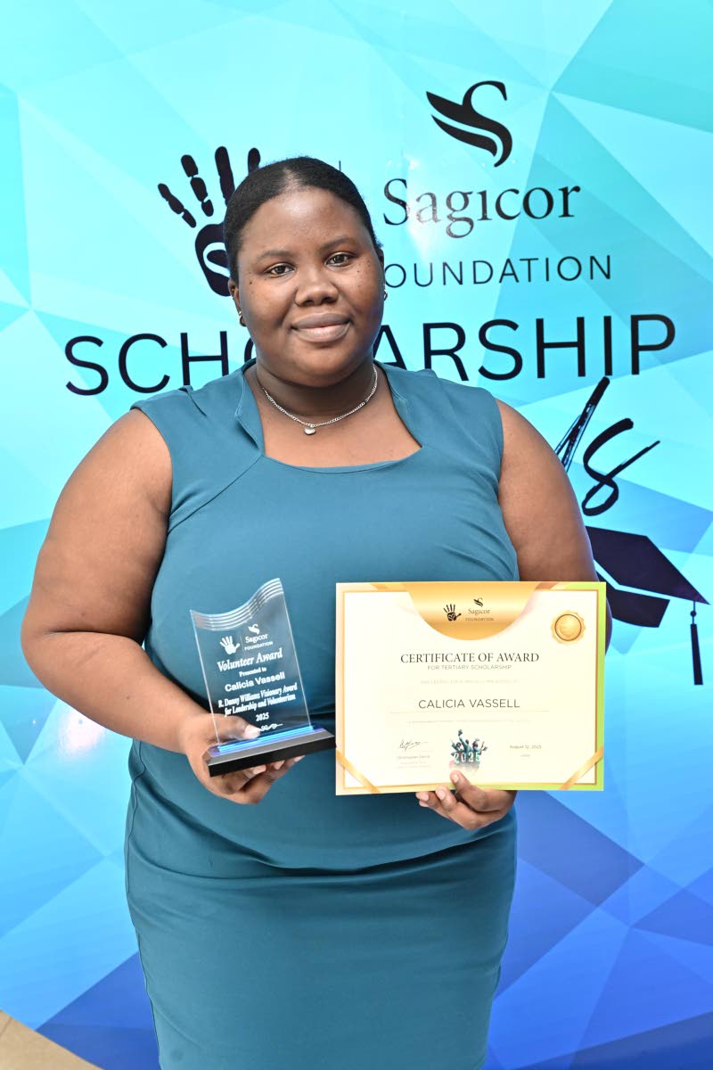 Tears welled in Calicia T. Vassell’s eyes as two familiar faces lit up the big screen in the ballroom of The Jamaica Pegasus on Tuesday morning. There was her mentor, Germaine Barrett, CEO and president of the Jamaican Association for Debating and Empowerment (JADE), alongside her teammate and deputy programmes manager, Joshua Atkins. In a heartfelt video tribute, they officially shared the news that Vassell had been selected as the recipient of this year’s R. Danny Williams Visionary Award for Leadership and Volunteerism, announced during Sagicor Foundation’s annual scholarship awards ceremony.