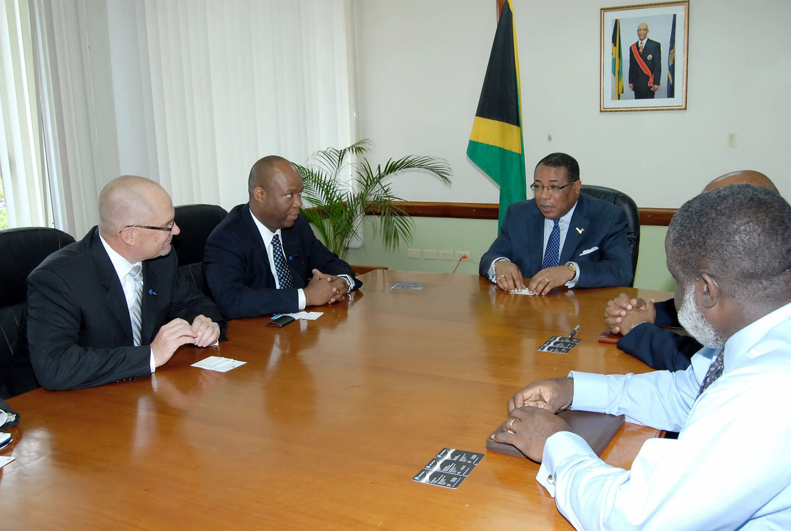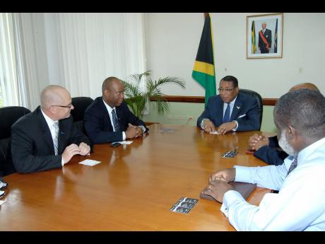 Minister Anthony Hylton updates Columbus' managing director Sean Latty and vice president of Columbus Business Solutions Grant Hume on the status of the Jamaica Logistics Hub Project.
