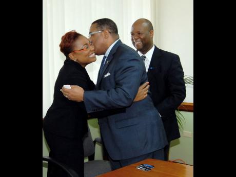 Gail Abrahams, director of corporate communications receives a warm greeting for Logistics Minister, Anthony Hylton in a recent courtesy call by members of the Columbus Team recently. Head of Columbus Communications Jamaica Sean Latty, looks on.