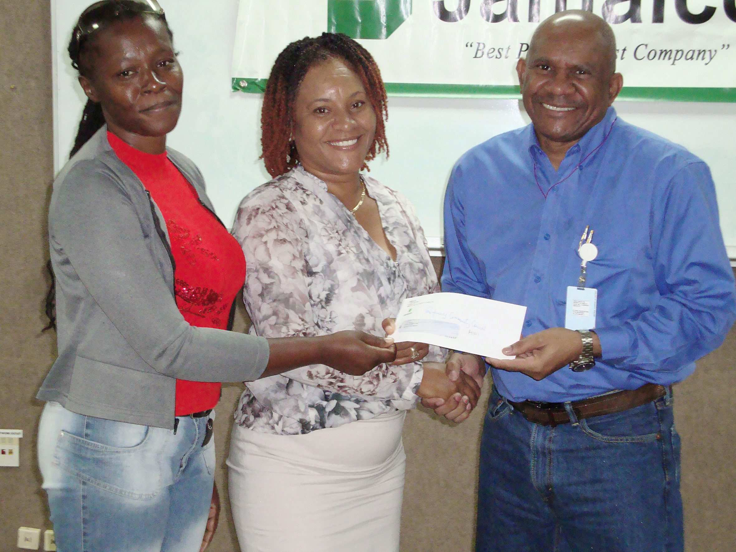 Jamalco’s Chief Operating Officer Richard Russell presents a cheque valued at US$2,500 to chairman of the Refinery Community Council, Lorine Cousins (left). Sharing the occasion is a member of the Top Halse Hall community, Ann-Marie Edwards.