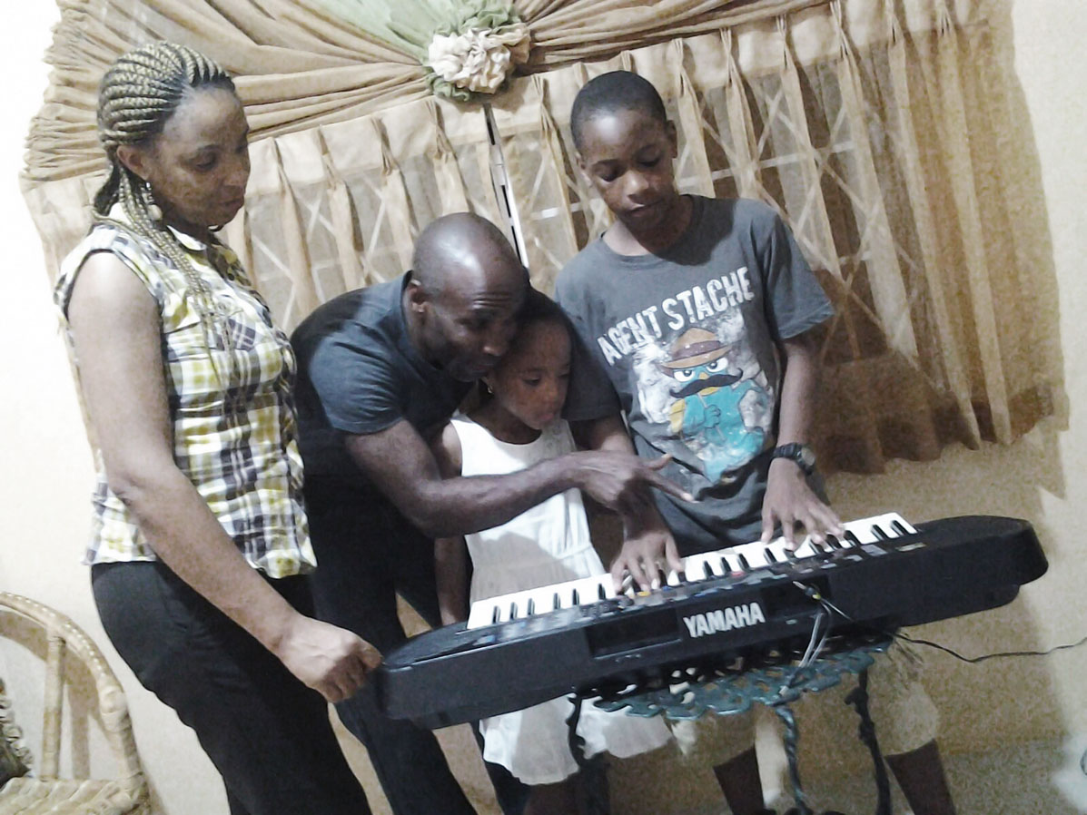 Family time sometimes involves the kids showing off skills from extra-curricular activities. From left, mom, Maxine; daddy, Lenroy; and daughter Aaprel learn something new as Aaron plays a piece.