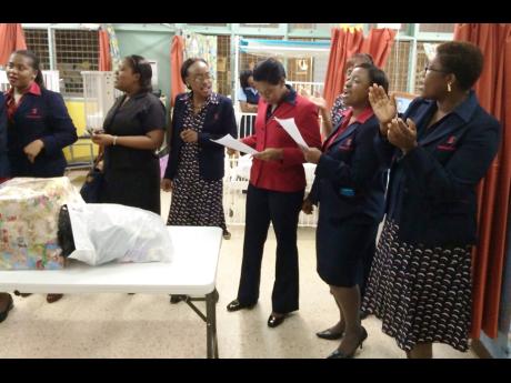 Scotiabankers belt out Christmas songs in the paediatric ward of the St Ann’s Bay Hospital during a surprise treat put on by the team. From left are Rosalee Virgo, Venice Williamson, Chelsea-Ann Sharpe, Joan Lloyd, Andrea McDonald (hidden), Aldale Johnson, and Karen Cunningham.