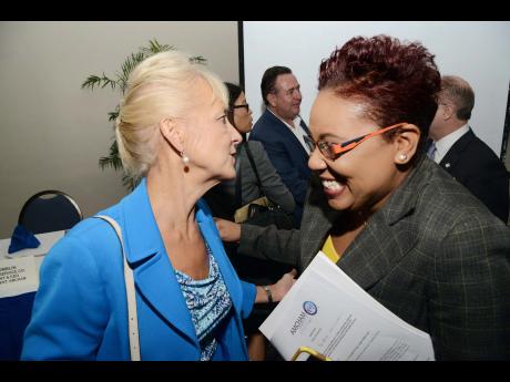 Gail Abrahams (left), chief executive officer of the American Chamber of Commerce (Jamaica), has the ear of Kelly Tomblin, vice president of the organisationt the AMCHAM- Ernsy and Young seminar on transfer pricing at the Tamaica Pegasus hotel in New Kingston on Tuesday February 16.