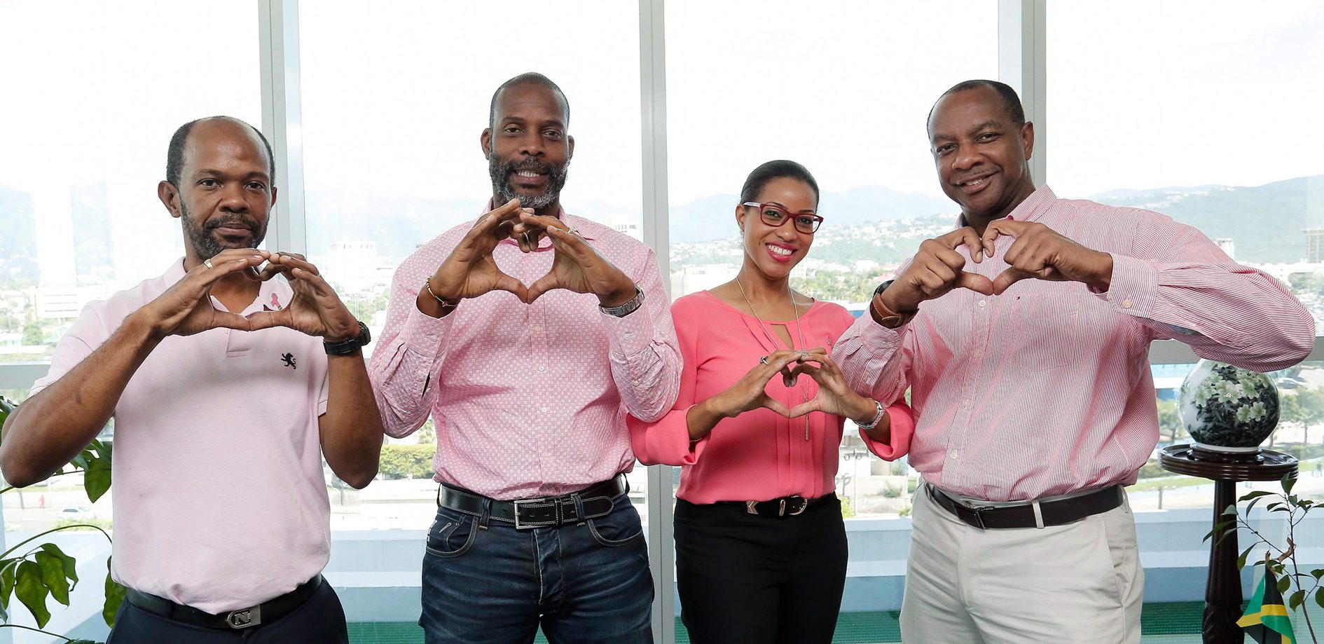 In support of breast cancer awareness, male executives at FLOW Jamaica showed their support. From left are Nigel Facey, head of TV; Garry Sinclair, managing director; and Pete Smith, regional regulatory finance adviser. Joining them is Kayon Wallace (second right), director of corporate communications and stakeholder management.