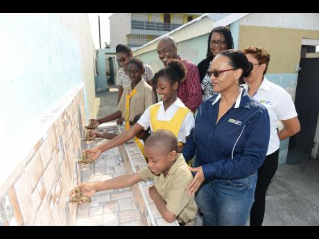 The NCB Foundation approved a donation of over $250,000 to the institution which is a select member of the NCB Group's Adopt-a-School programme – a project that allows NCB branches to directly assist schools in their respective vicinities. A total of 31 primary-level institutions benefit annually from assistance in the form of cash, kind and voluntary services by NCB employees, through the initiative launched in 2014. From right NCB's Claudette Rodriquez, AGM Payment Services; Michelle Thomas - product and portfolio manager/issuing; (partly hidden) Bridgette Lindsay; Peter Higgins, assistant genral manager, Treasury & Correspondent Banking; and Nadine Hibbert, principal, Whitfield Town All-Age School, along with students show off the school's newly refurbished water trough, courtesy of NCB Foundation.