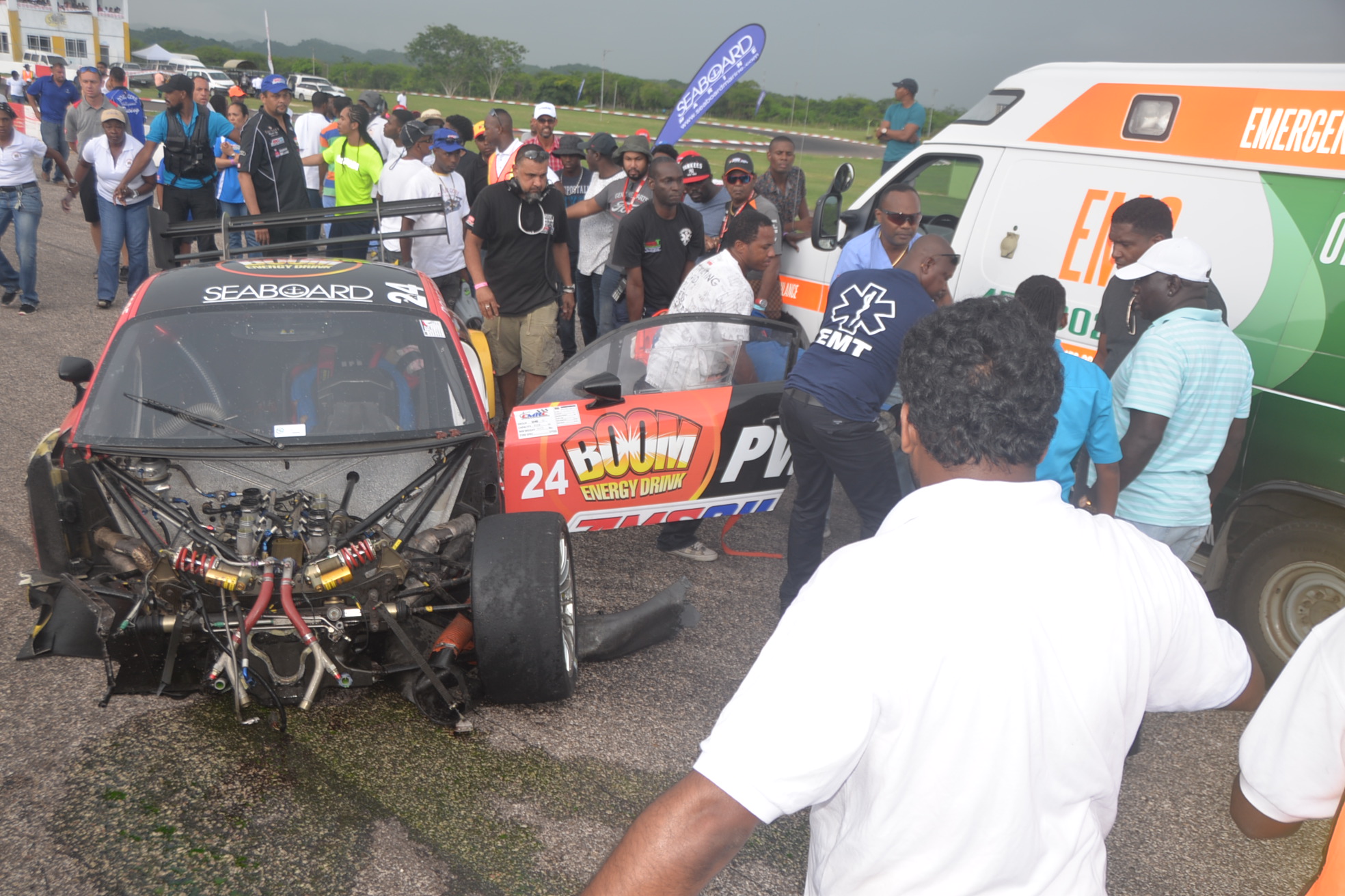 Two race officials who were on the side of the track also sustained injuries and had to be taken to the hospital following the crash that happened in the last race of the day, the Seaboard Marine Caribbean Motor Racing Championship (CMRC) Group 4, which also doubled as the main event.