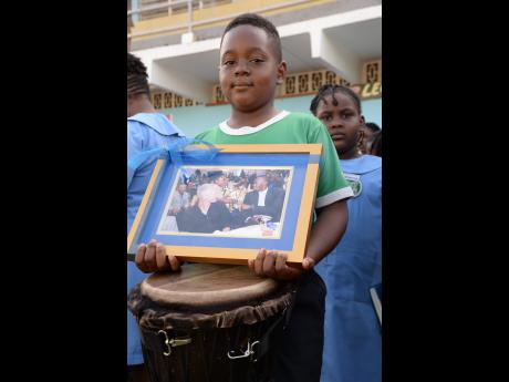 Principal of the Ardenne Preparatory and Extension School, the Reverend Myrtle Clarke, and the conceptualiser and director of Lightning Drummers, Karen Davis, were delighted and welcomed the special presentation of the Usain Bolt autographed photo to Justin Reid.