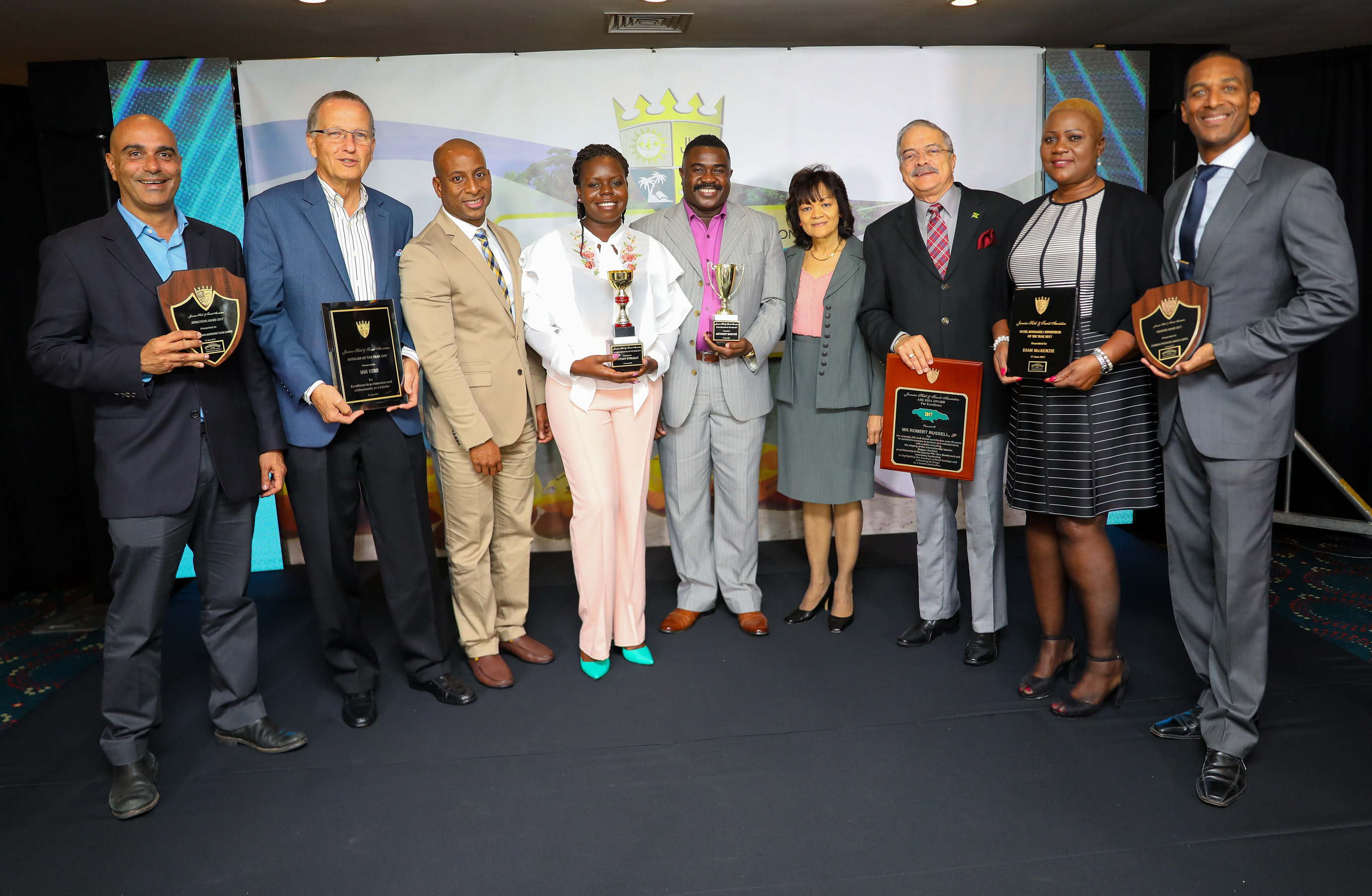 Recipients pose with JHTA President Omar Robinson (third left) and Executive Director Camille Needham (fourth right) after accepting their awards.